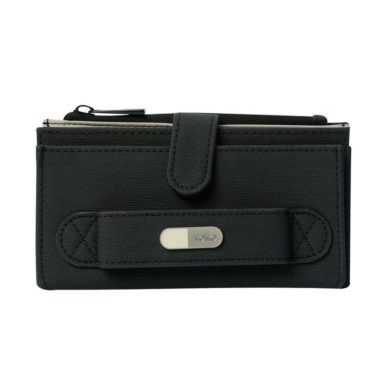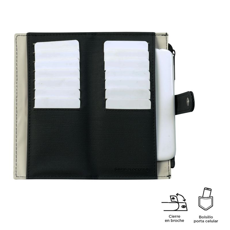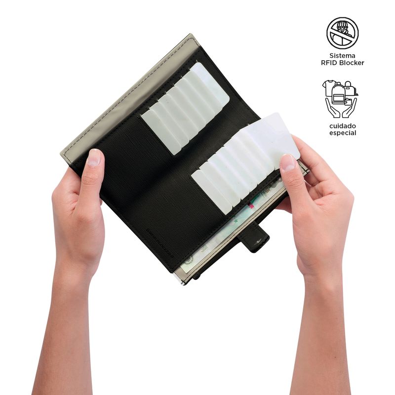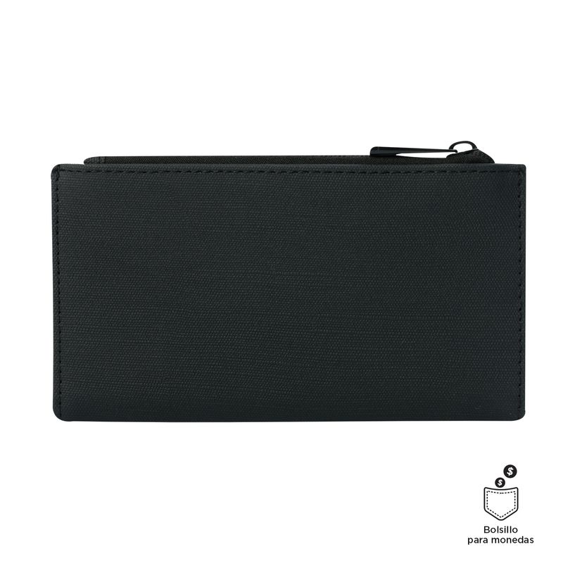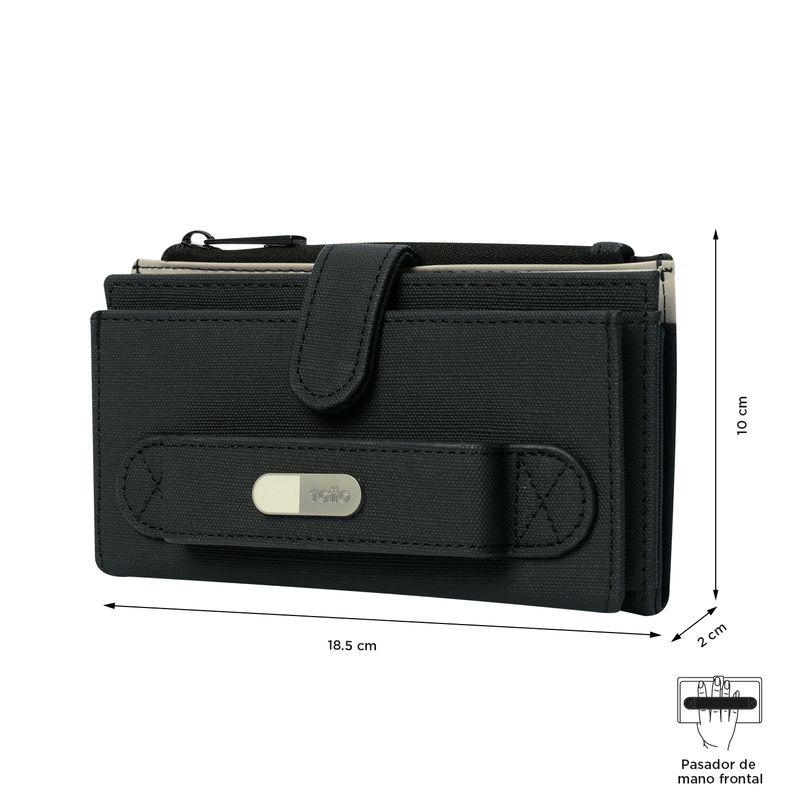 La billetera Dull L ofrece todo lo que una mujer moderna necesita. Con dos cuerpos amplios, incluye un práctico bolsillo porta celular, RFID Blocker para proteger tus datos, y un seguro cierre con broche. Los organizadores para tarjetas y billetes mantienen todo ordenado, mientras que el pasador de mano añade comodidad en su transporte. Su logo combinado de plástico y metal agrega un toque de elegancia.