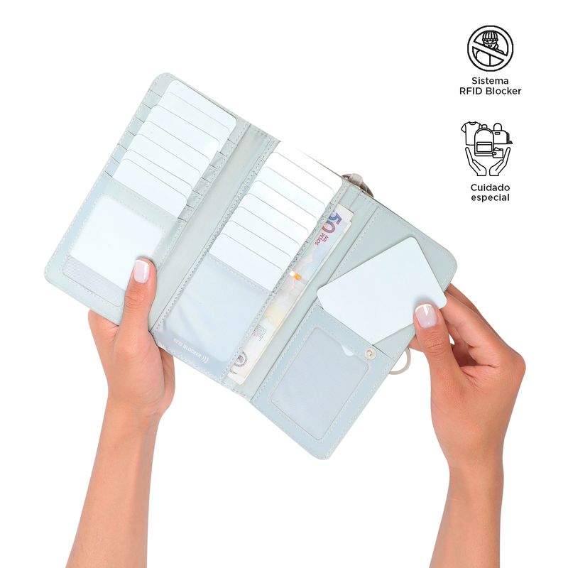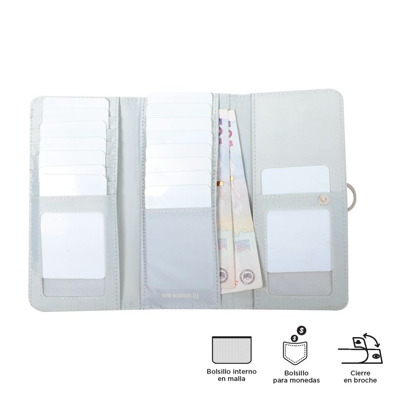 La billetera soft sub de tres cuerpos ofrece un diseño espacioso y funcional. Cuenta con bolsillo para monedas, tecnología RFID blocker, ajuste con cierre en broche y organizadores para tarjetas y billetes. Además, incluye un práctico bolsillo interno en malla. Perfecta para la mujer contemporánea que busca estilo y funcionalidad en un solo accesorio.