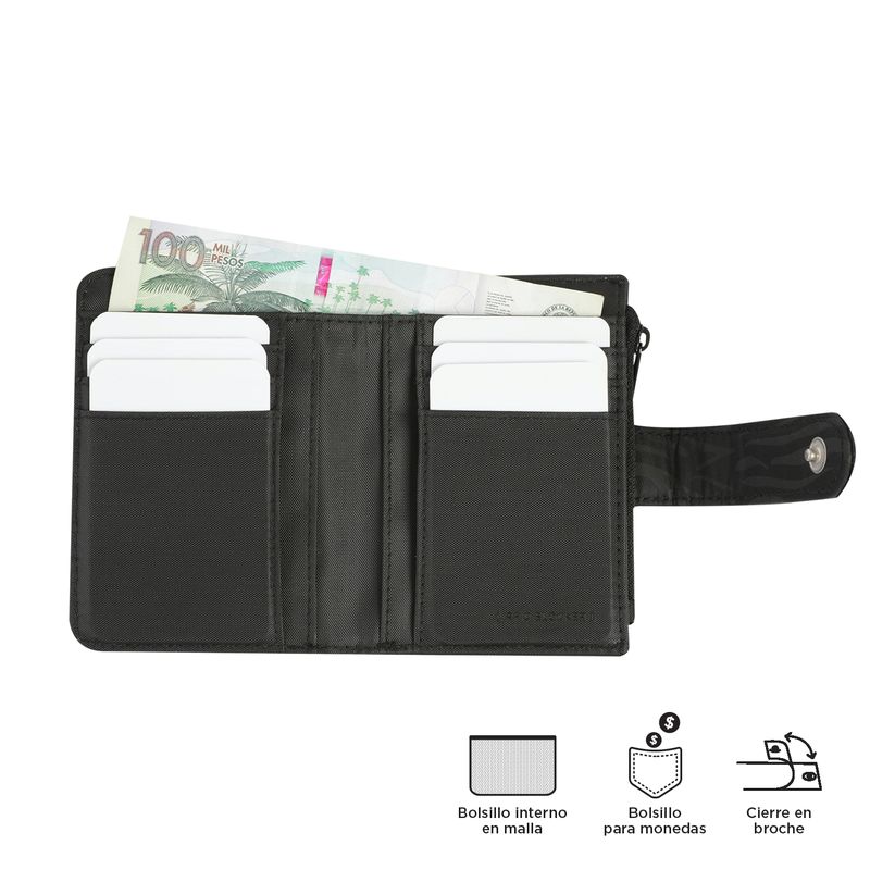 ¡Comodidad y protección en cada uso con la billetera Texture Twi! Su diseño de dos cuerpos incluye cierre en broche, bolsillo interno, compartimento para monedas y organizadores para tarjetas y billetes. Fabricada en poliamida, es resistente, ligera y de secado rápido. Además, su sistema RFID Blocker protege tu información personal de accesos no autorizados. ¡Consíguela ahora y disfruta de funcionalidad!